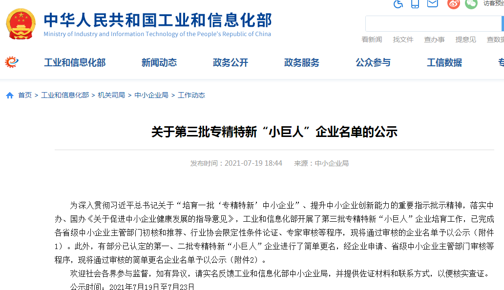 專精特新企業是指具有“專業化、精細化、特色化、新穎化”特征的中小企業,而國家級專精特新“小巨人”是專精特新企業的最高榮譽稱號,從省級專精特新“小巨人”企業中篩選,經國家工信部審核確認后發布。